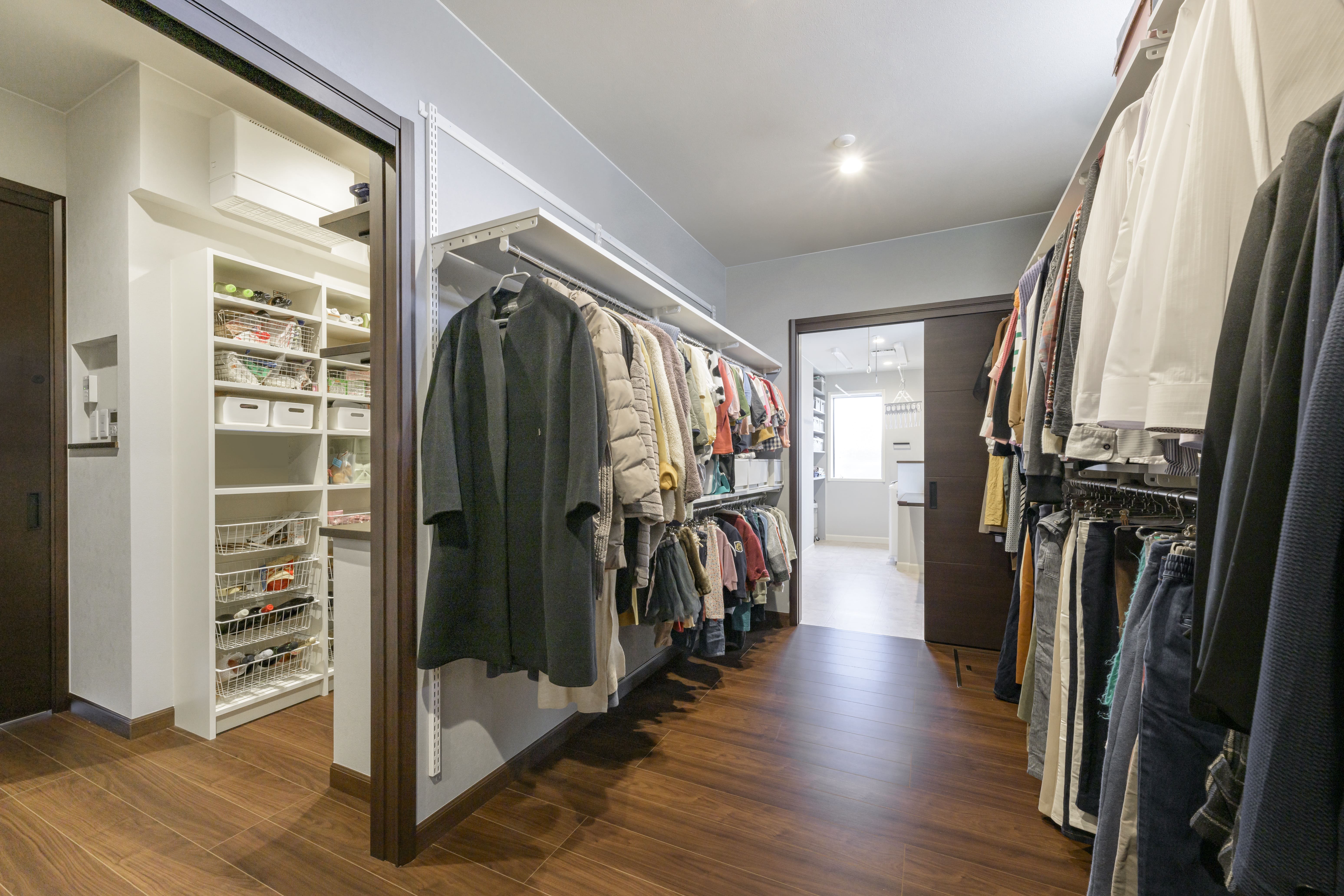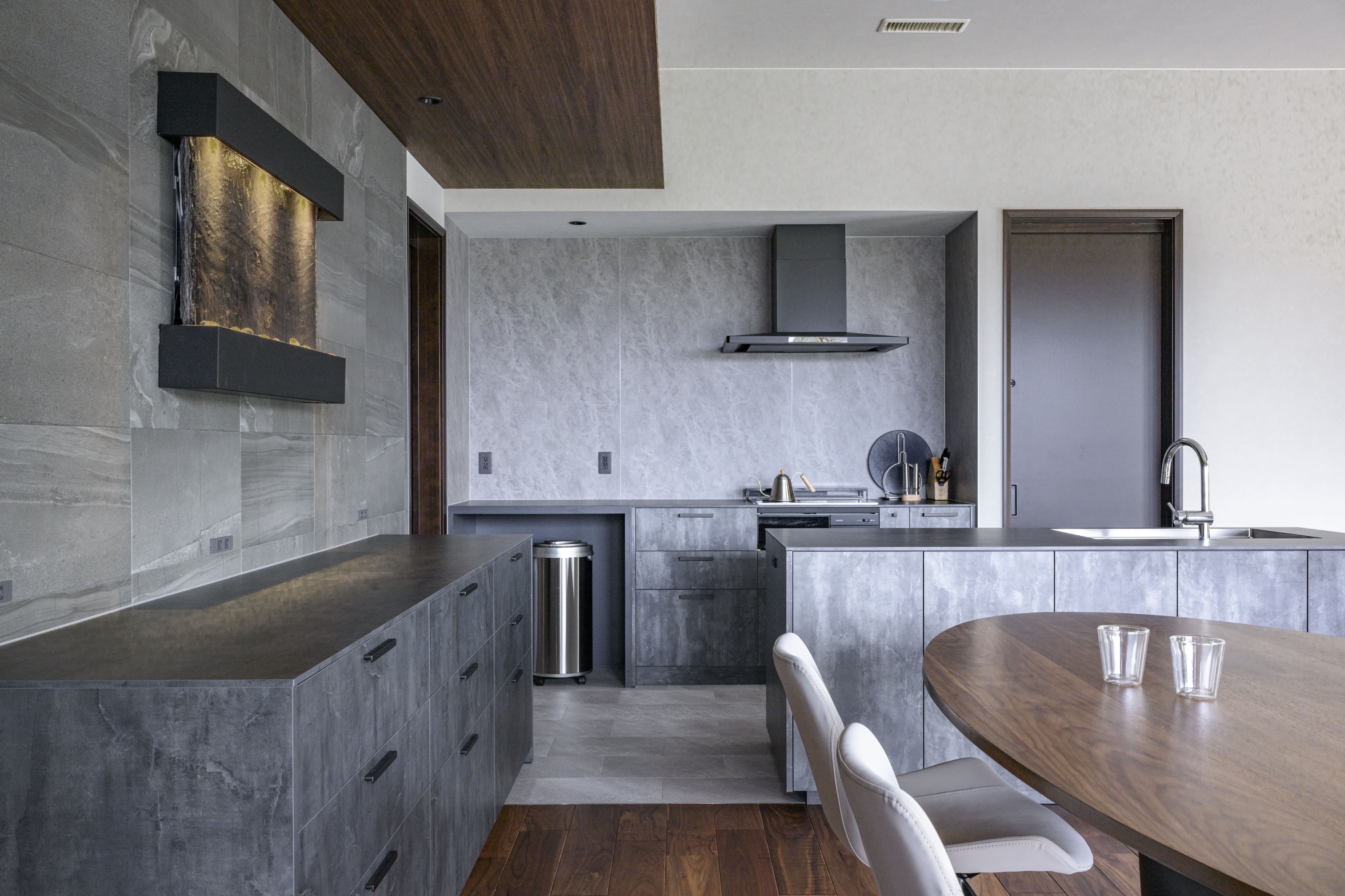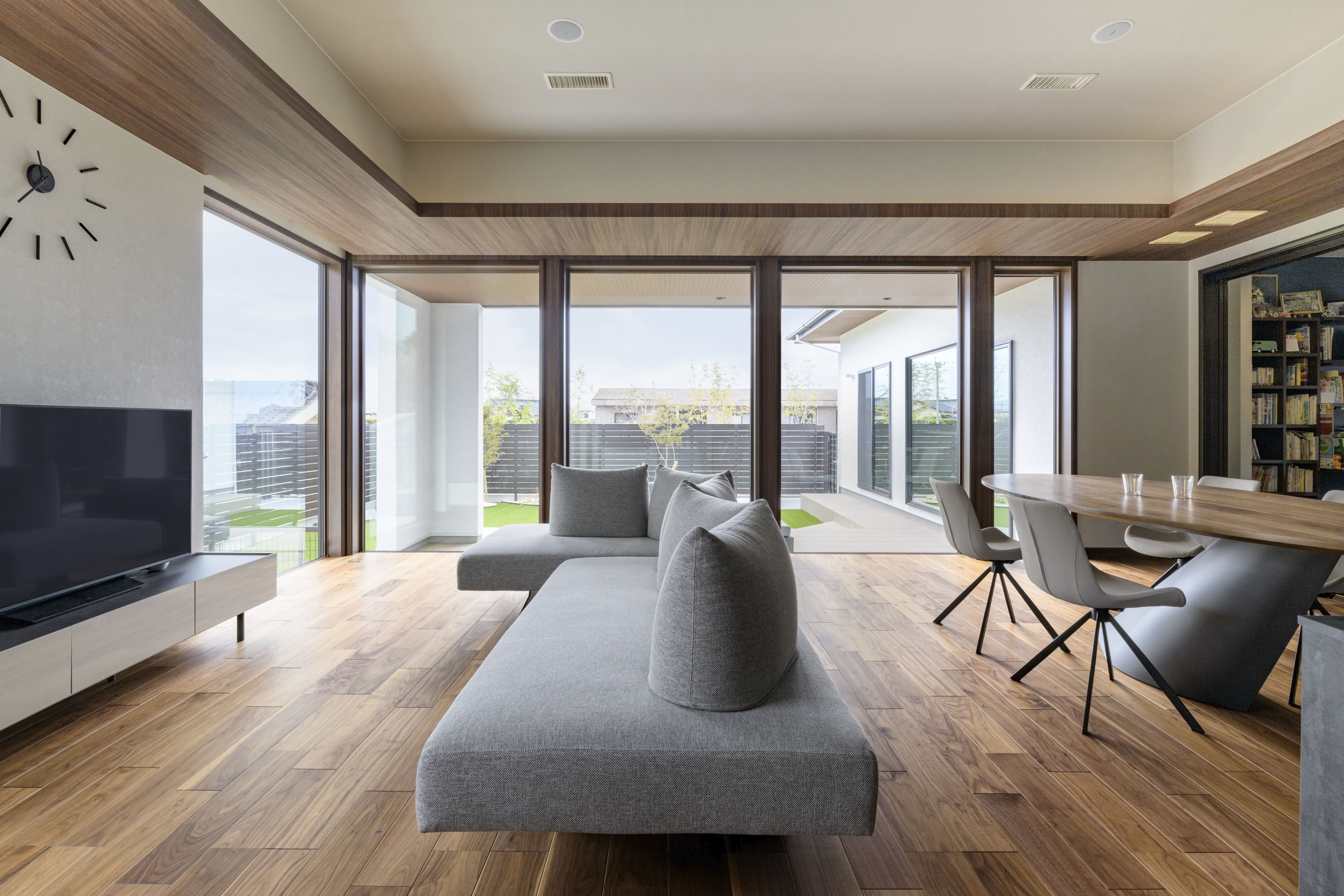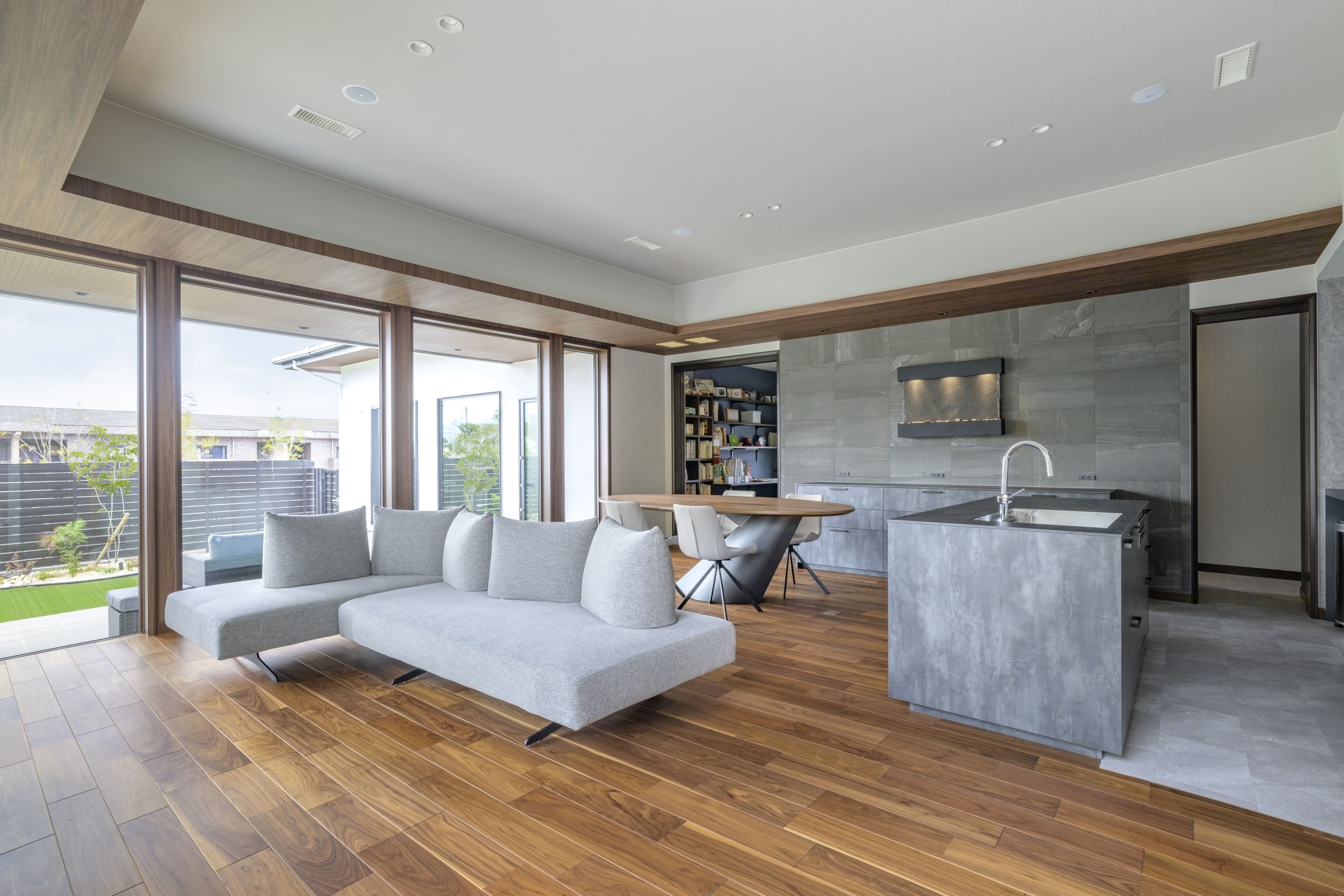 端正な印象の外観に、内観は落ち着きあるブラックウォルナットの床材をベースに、折り上げ天井でのびやかさを演出。アクセントウォールやキッチンの面材、家具などはグレー系ですっきりとモダンスタイルに。