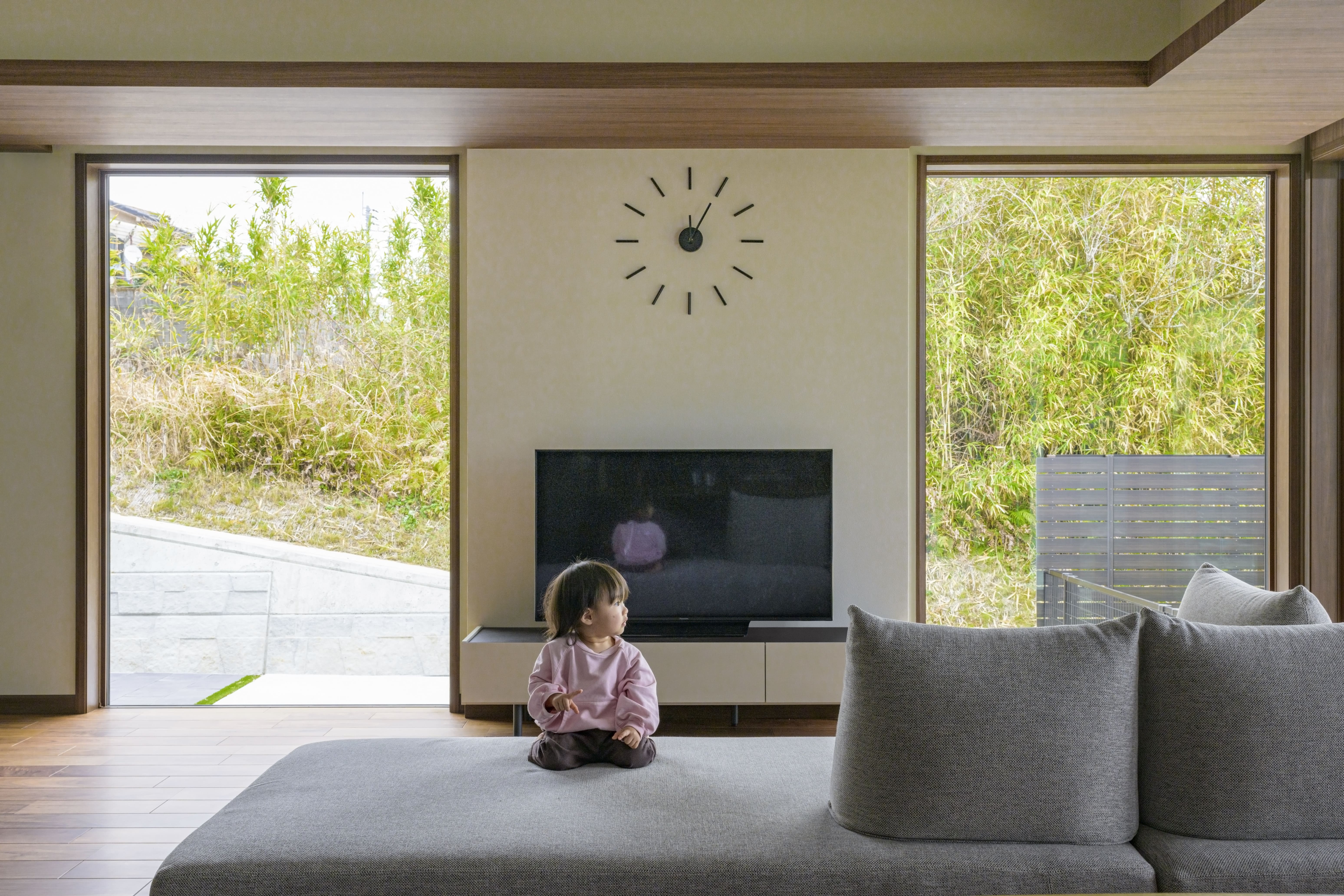 開放感に満ちた、 グレイッシュなモダンデザインの平屋