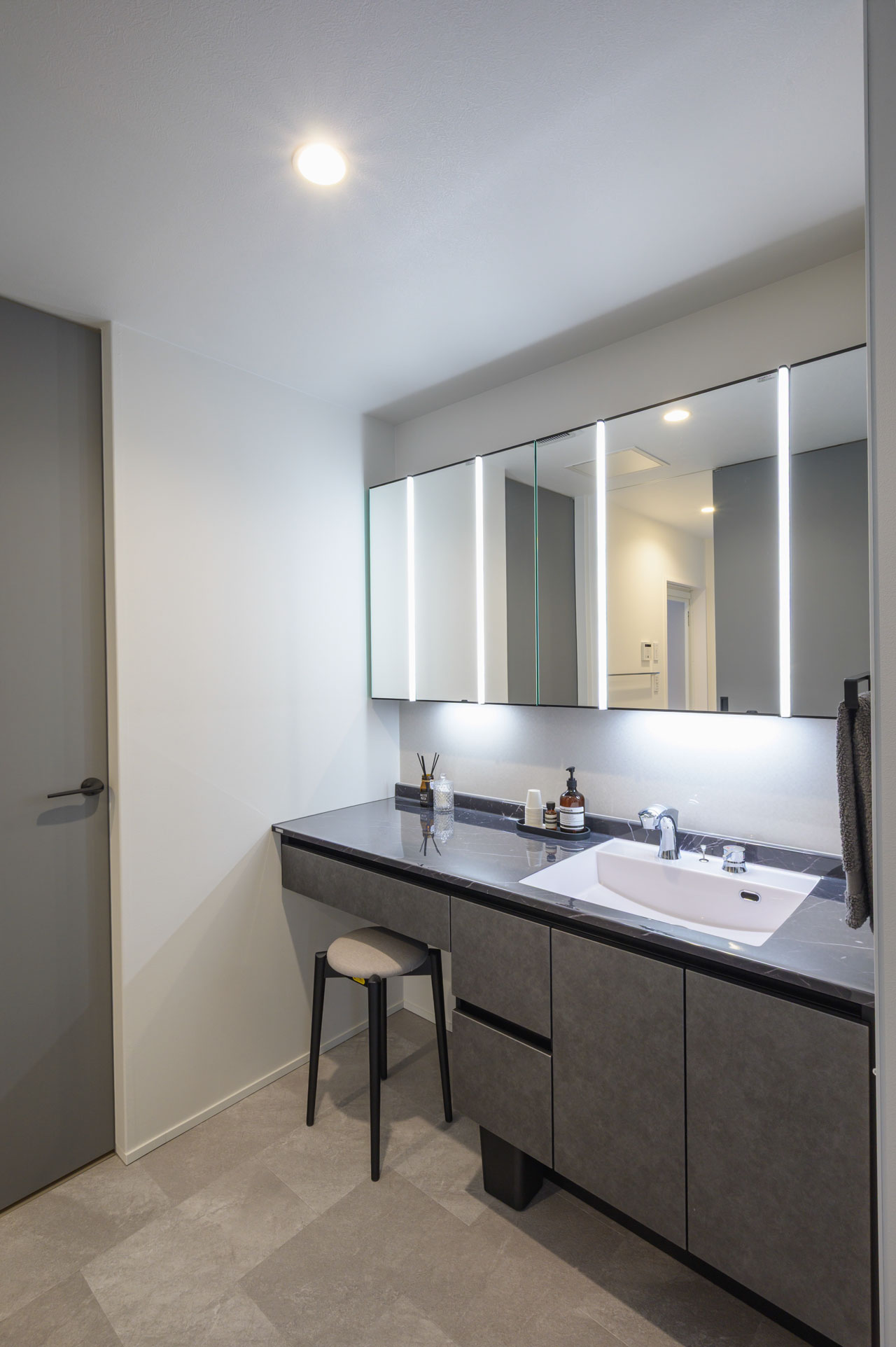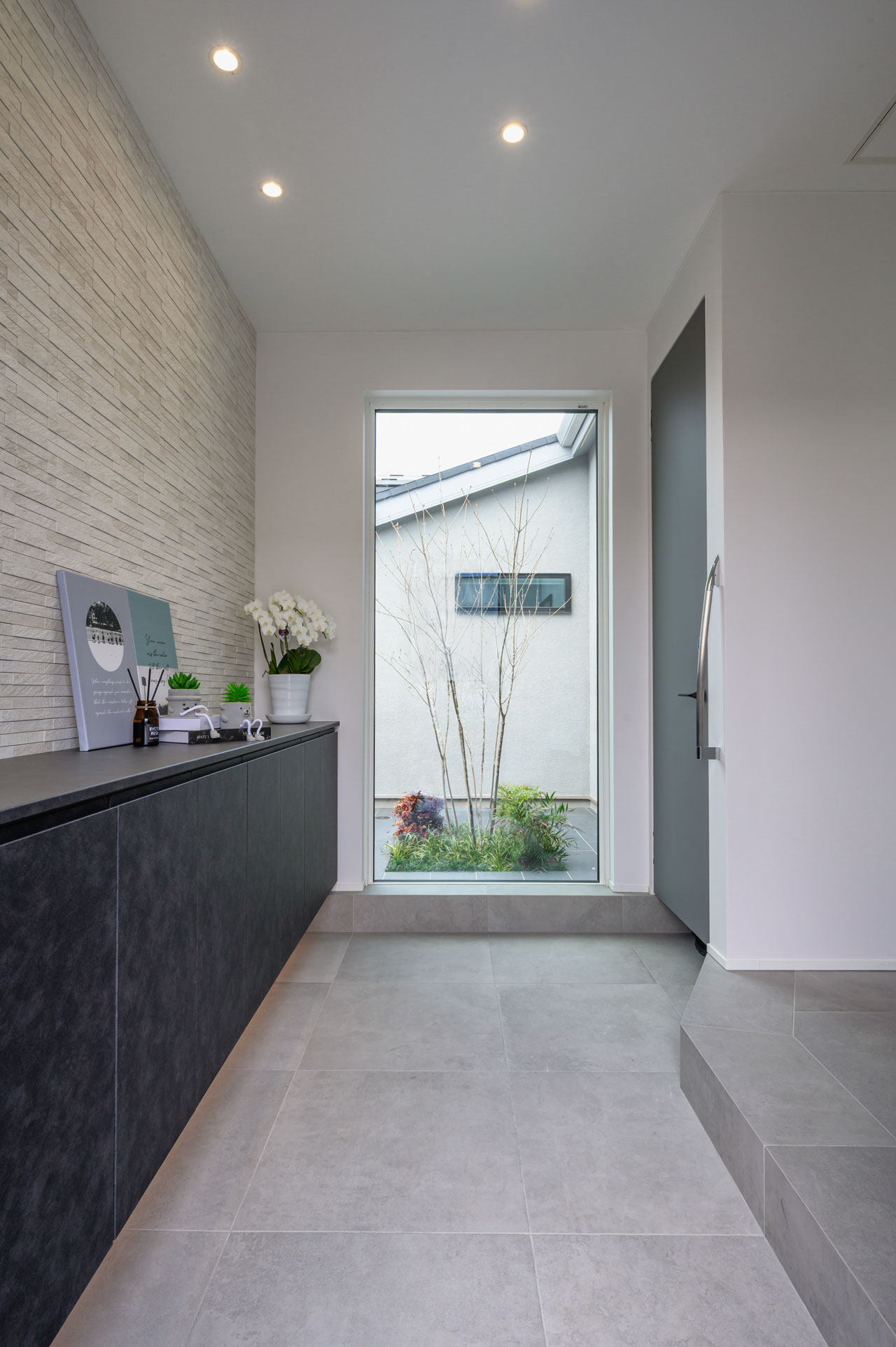 玄関には中庭の植栽が見えるピクチャーウィンドウを設け、来客を出迎える仕掛けに。玄関収納の上には奥様のセッティングされたディスプレイが玄関をセンスよく彩る。