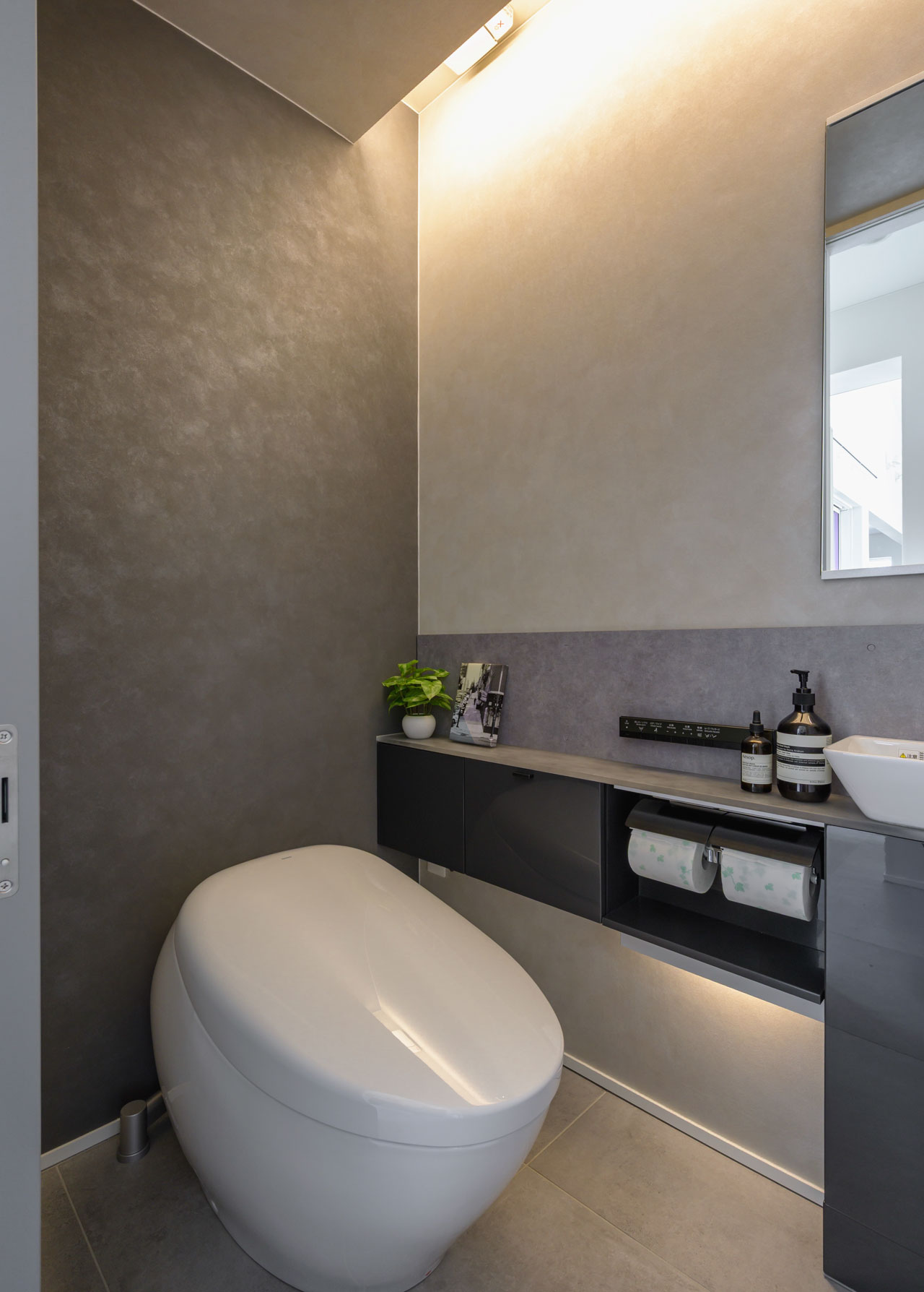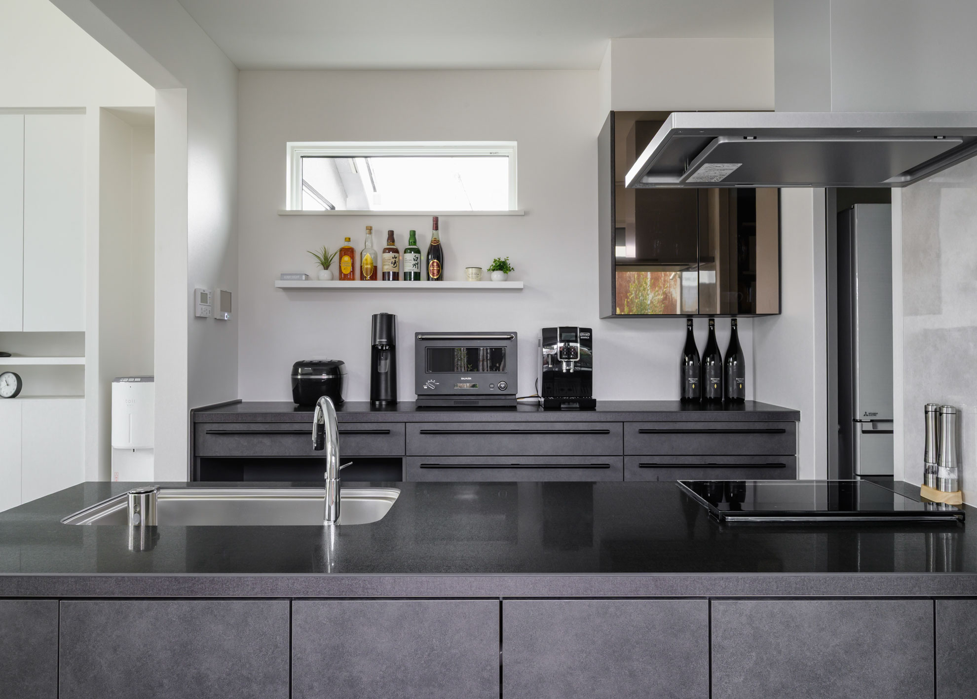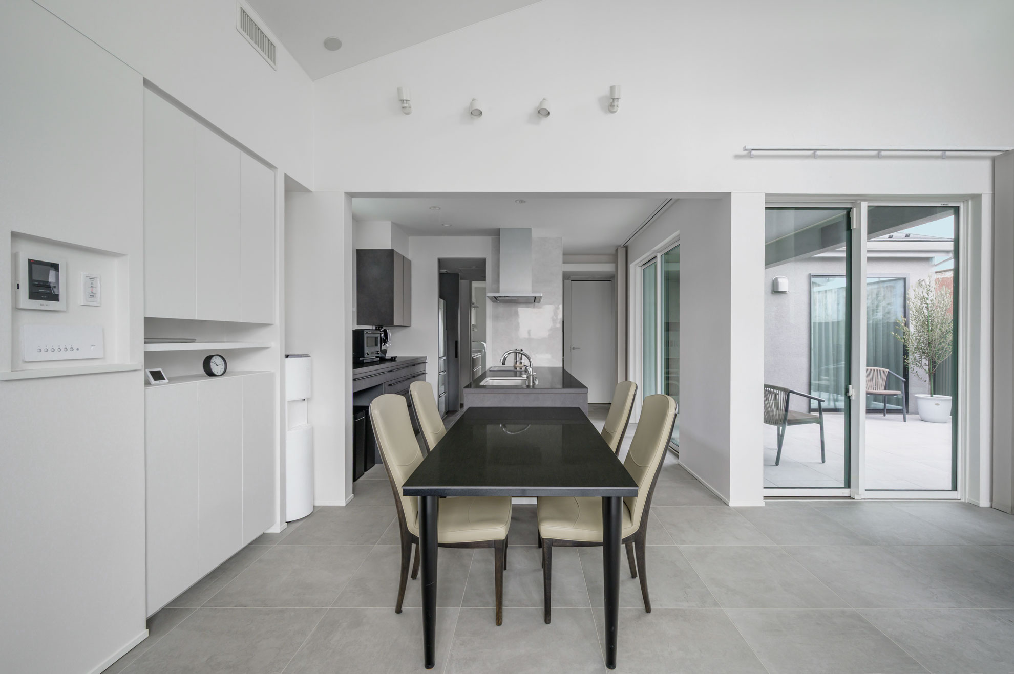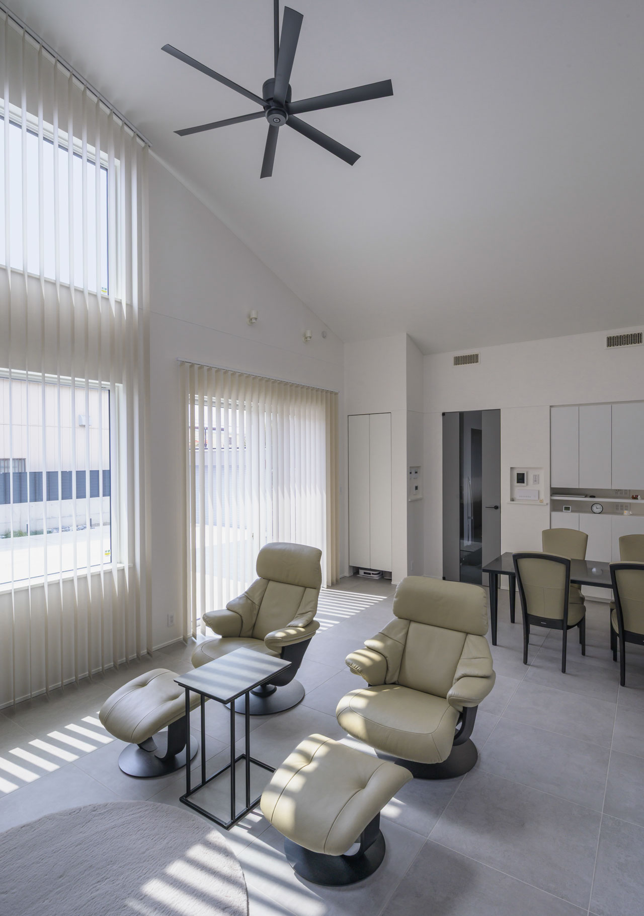 ゆとりある敷地に計画されたのは、終の棲家としての平屋建て。スロープシーリングで高さを出したリビングはホームシアターに。