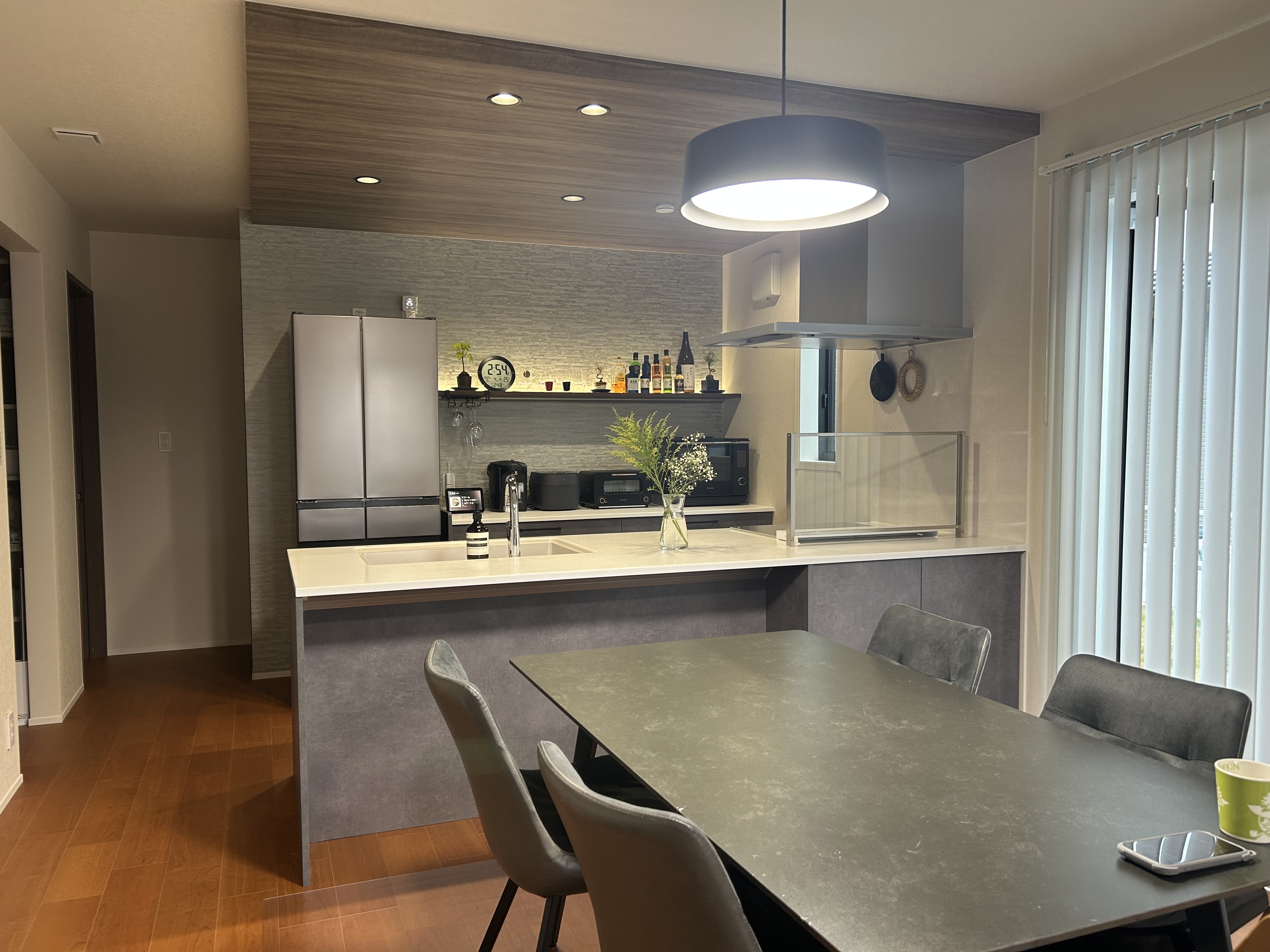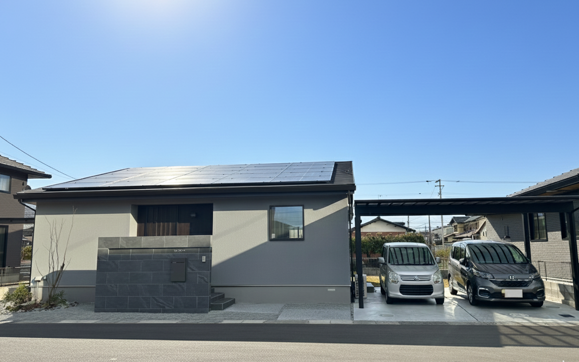 太陽光を搭載したモダンな平屋。落ち着いた外観と、趣味の道具を効率的に収納できる多機能な土間収納が特徴。木目調の天井と柔らかな照明が心地よい、広々としたダイニング・キッチンで家族の時間を楽しめる。