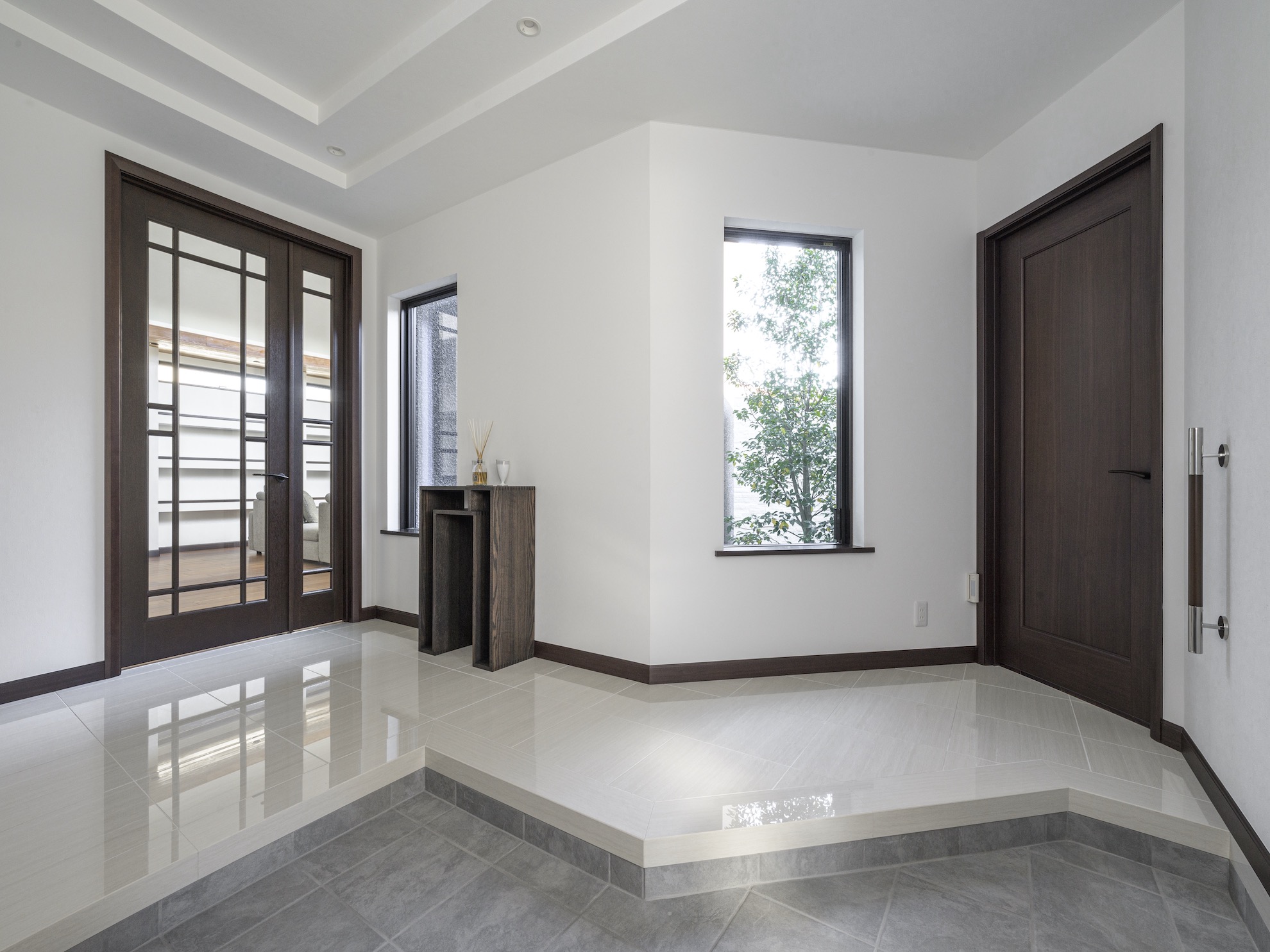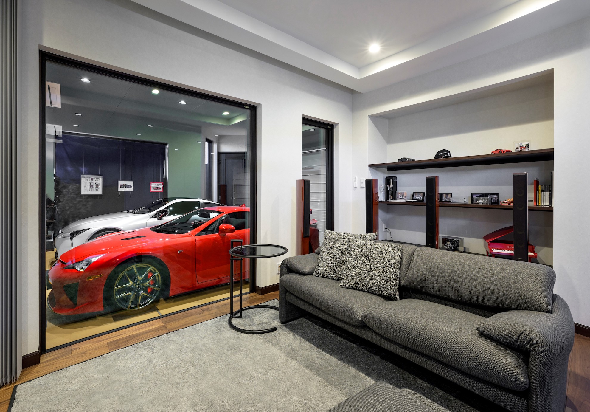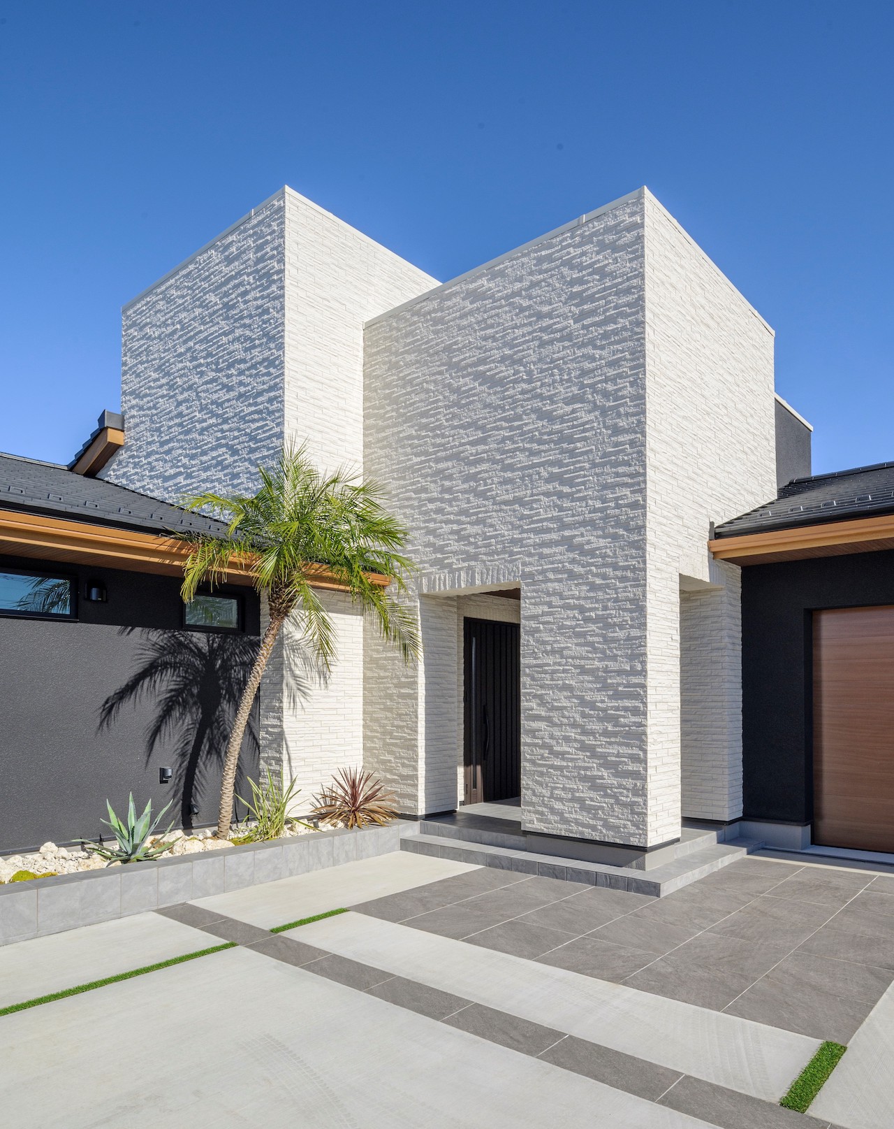 緩やかな勾配屋根の寝室エリアと白い外壁のエントランスエリア、そしてインナーガレージが一体に。