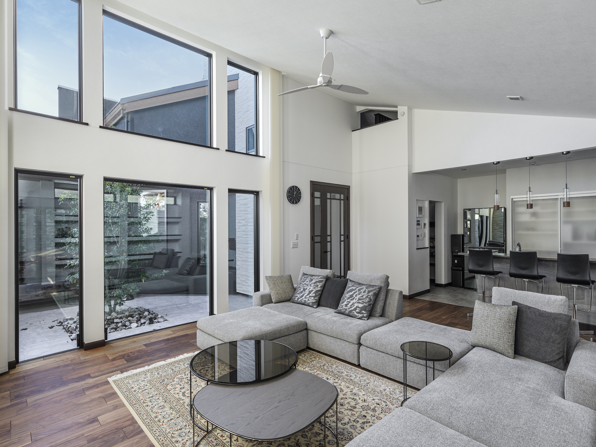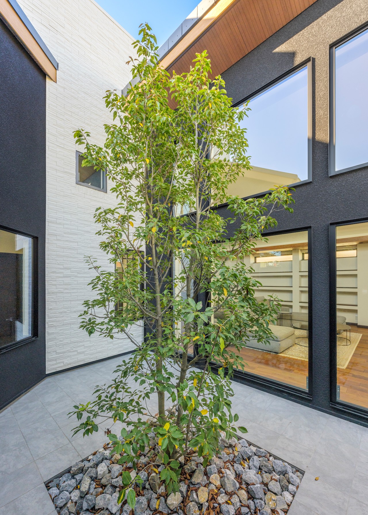 大きな開口部はコの字型に囲い込んだ中庭に向けて設け、外部からの視線を気にすることなく、屋外の開放感とたっぷりとした陽光を取り込んでいます。