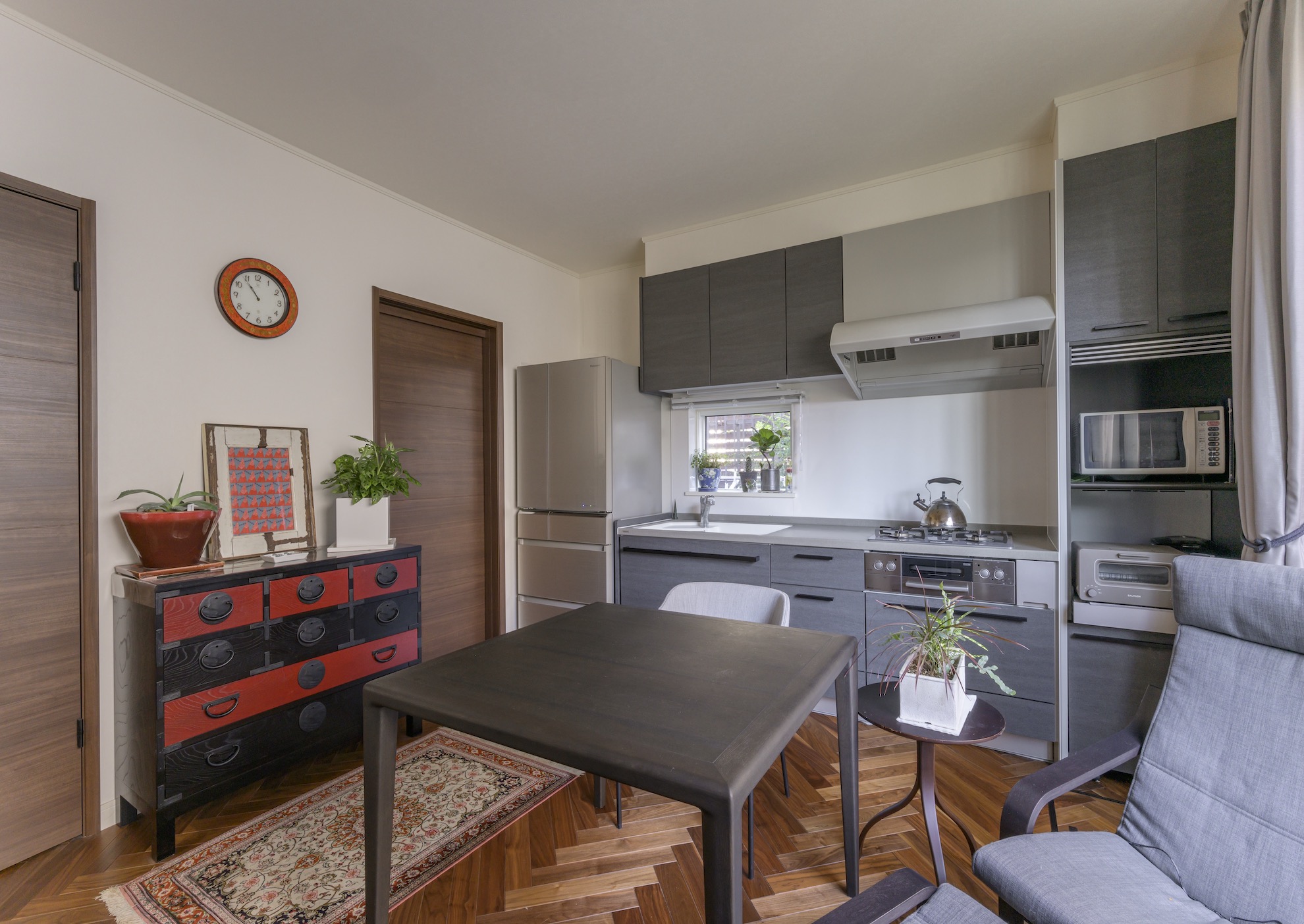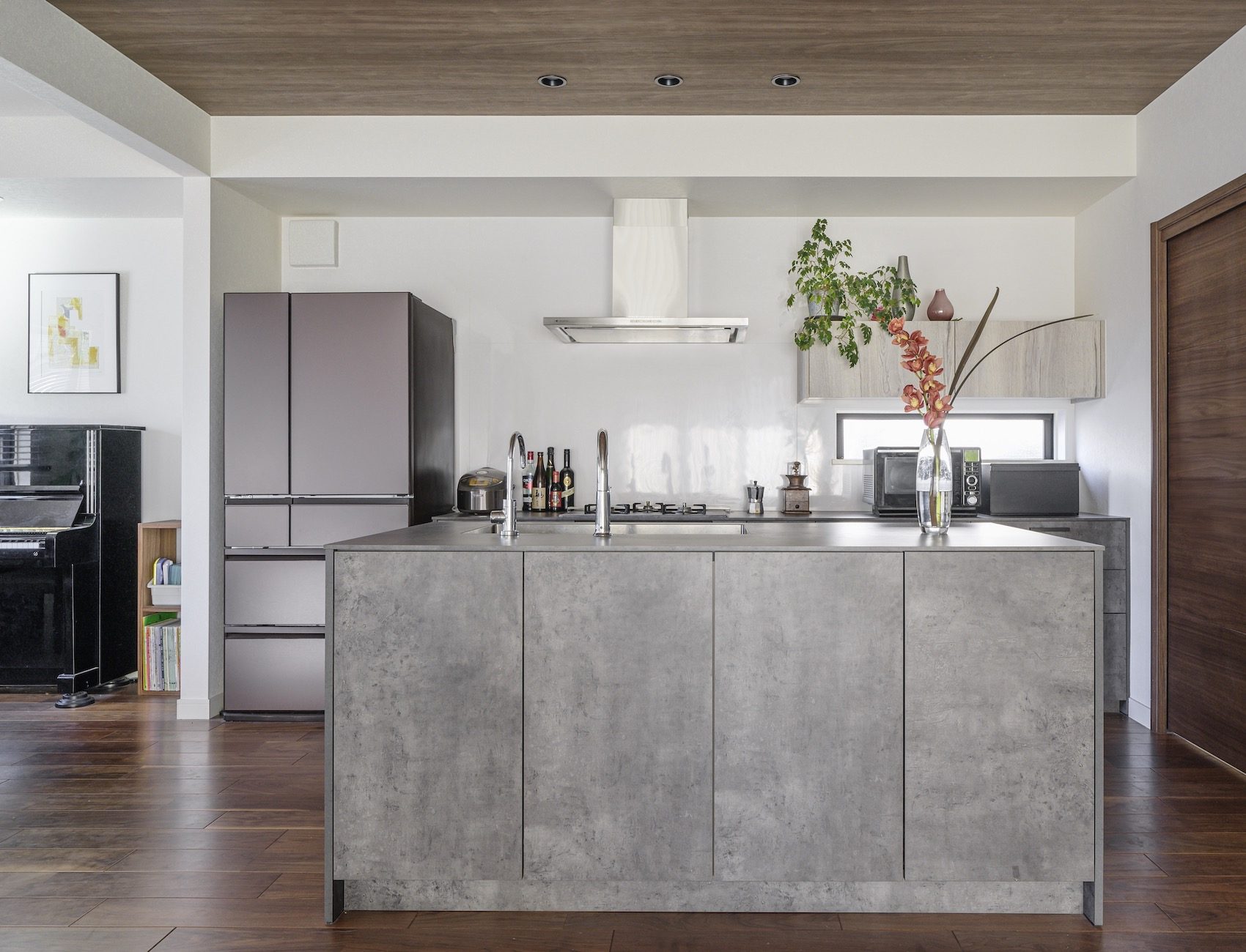 ダイニングは天井を白いクロスにすることで、空間の雰囲気を切り替えた。食事をしていても庭の景色が目に入り、自然の潤いが感じられる。