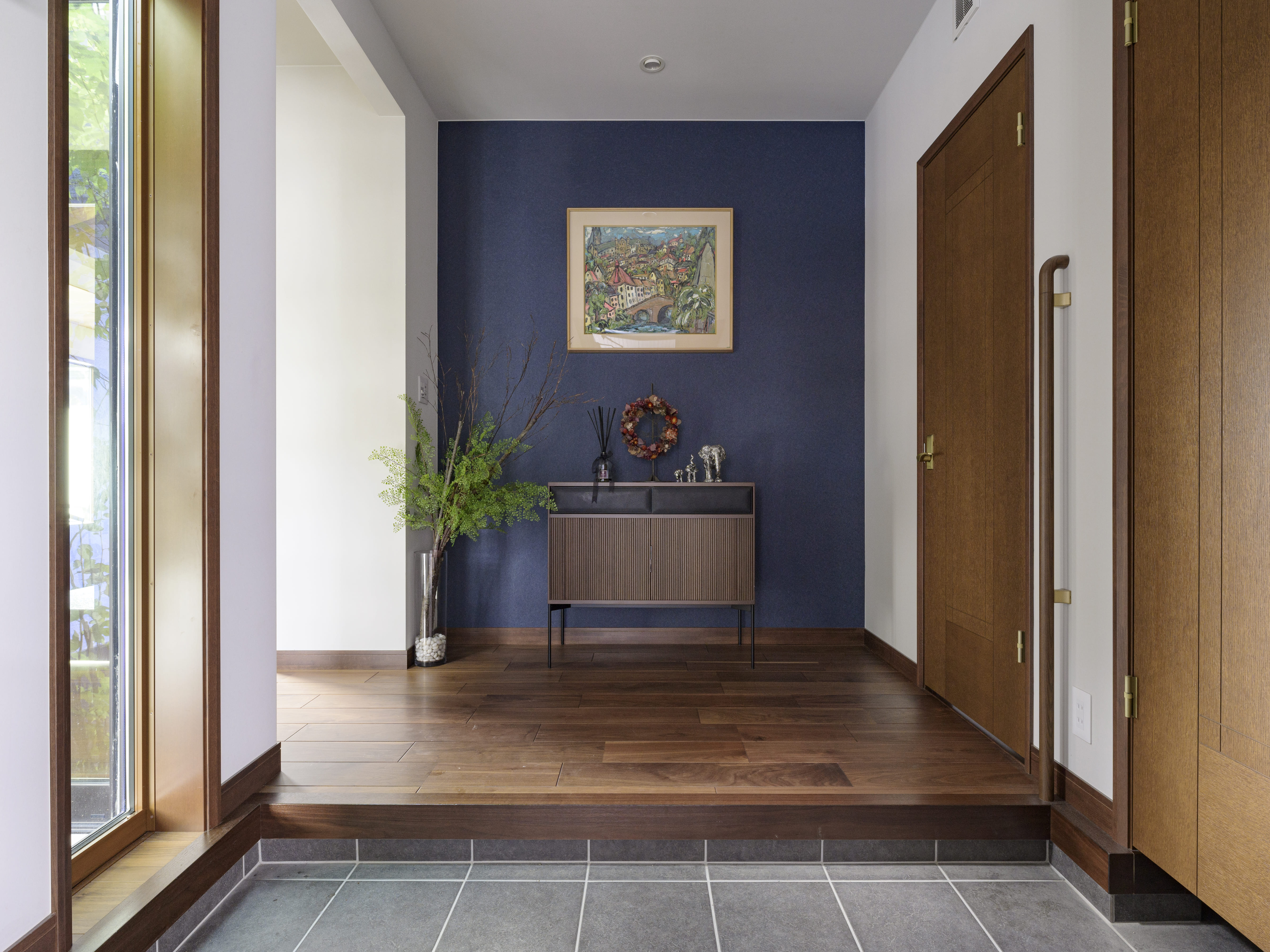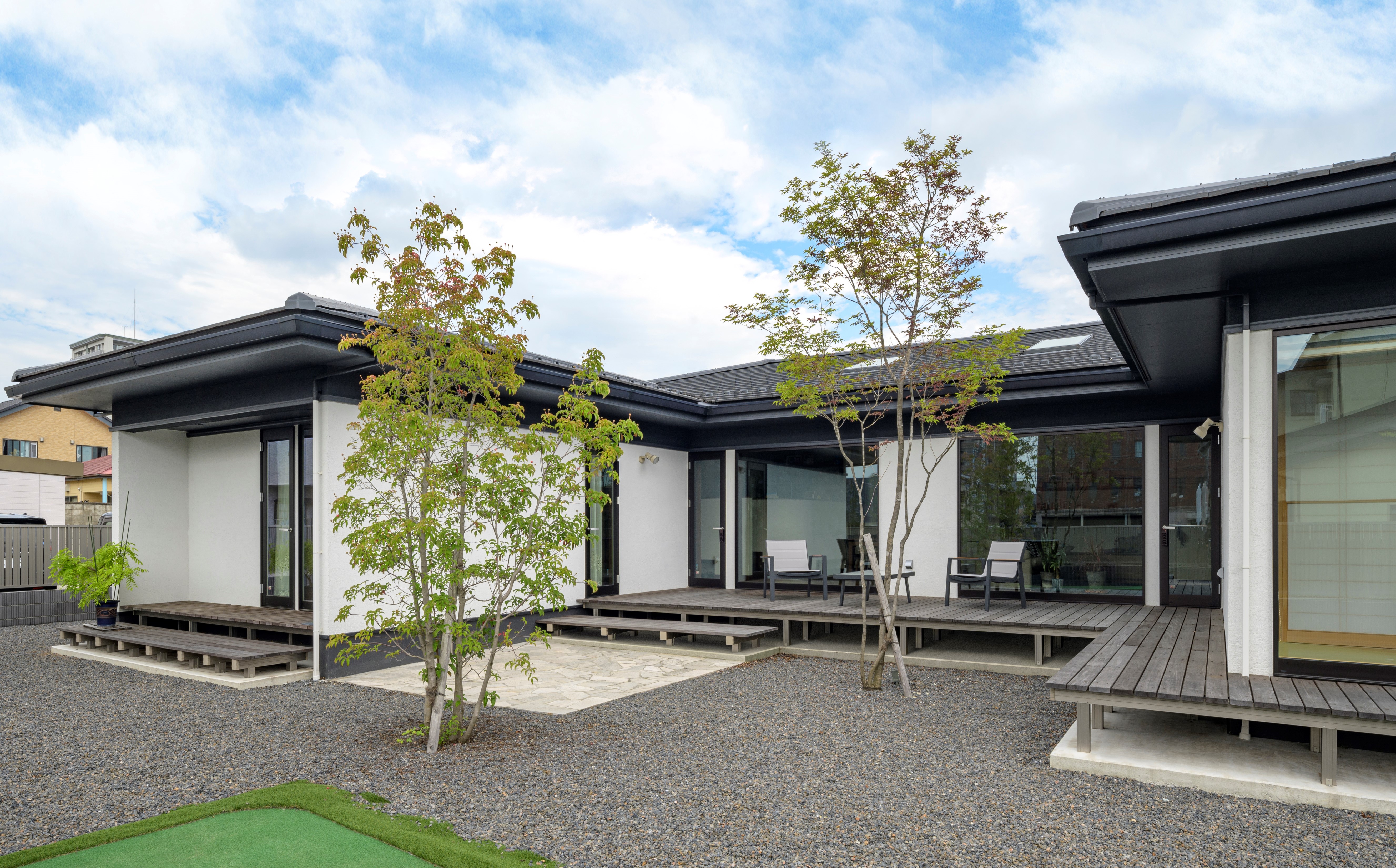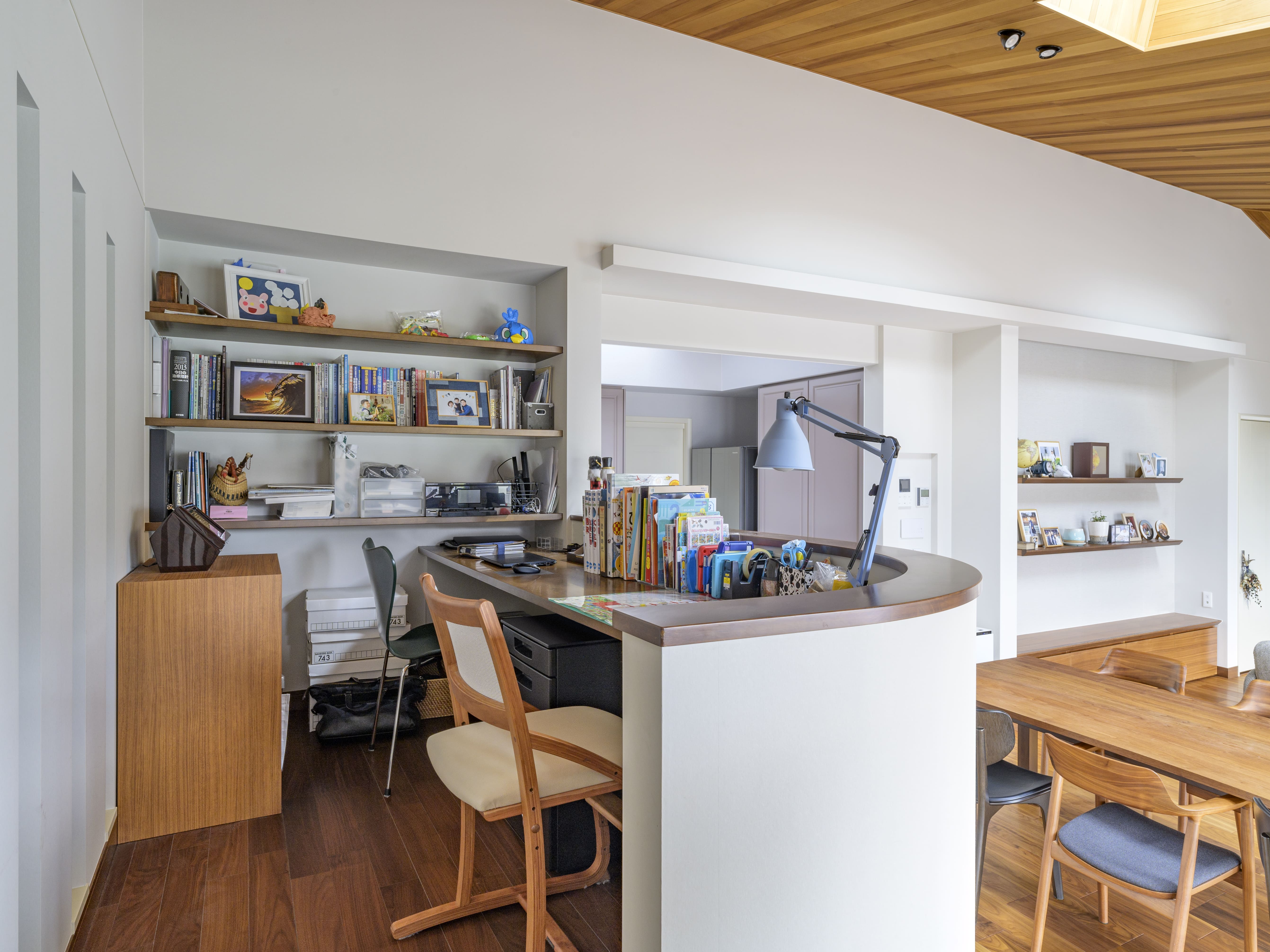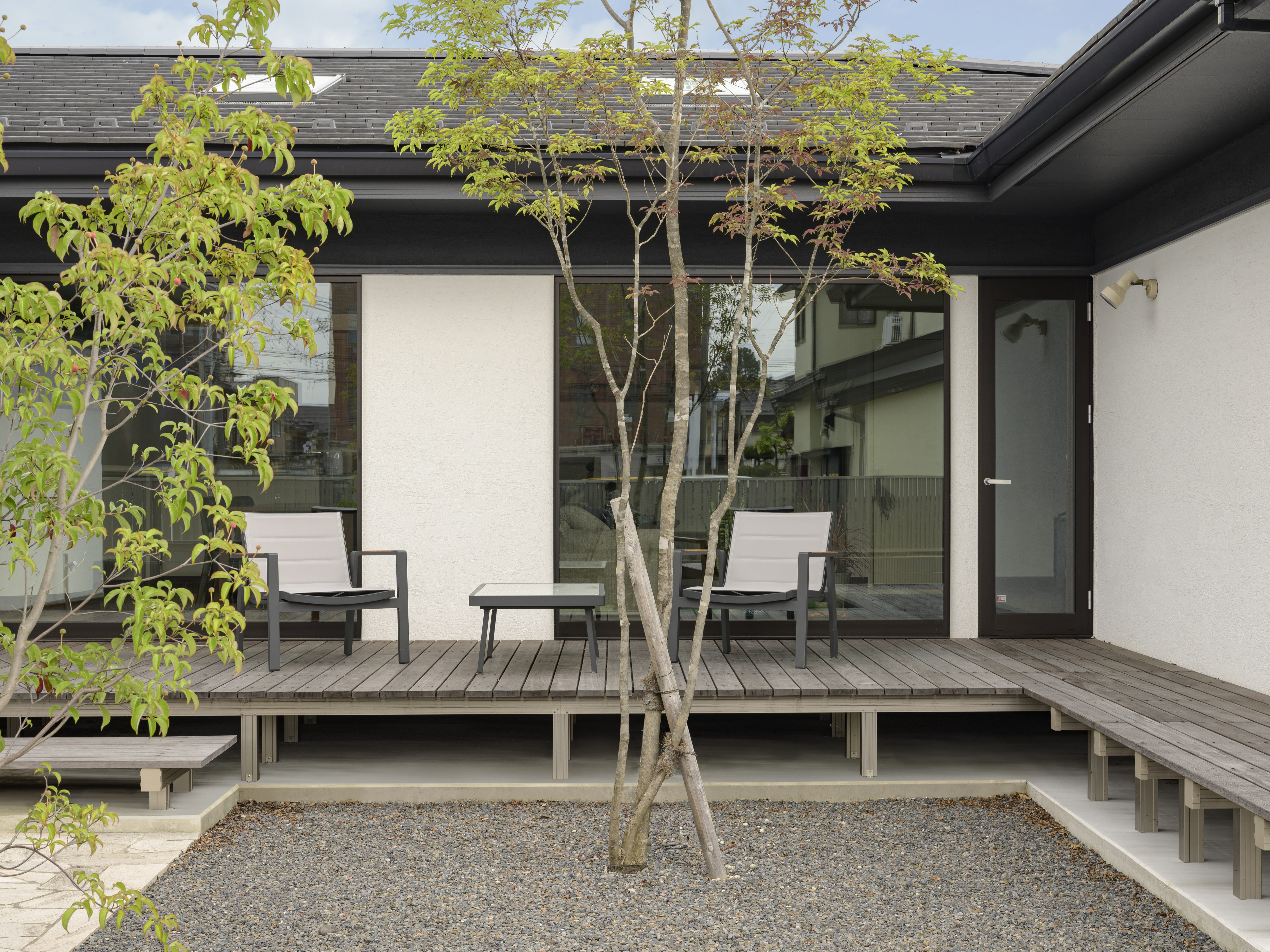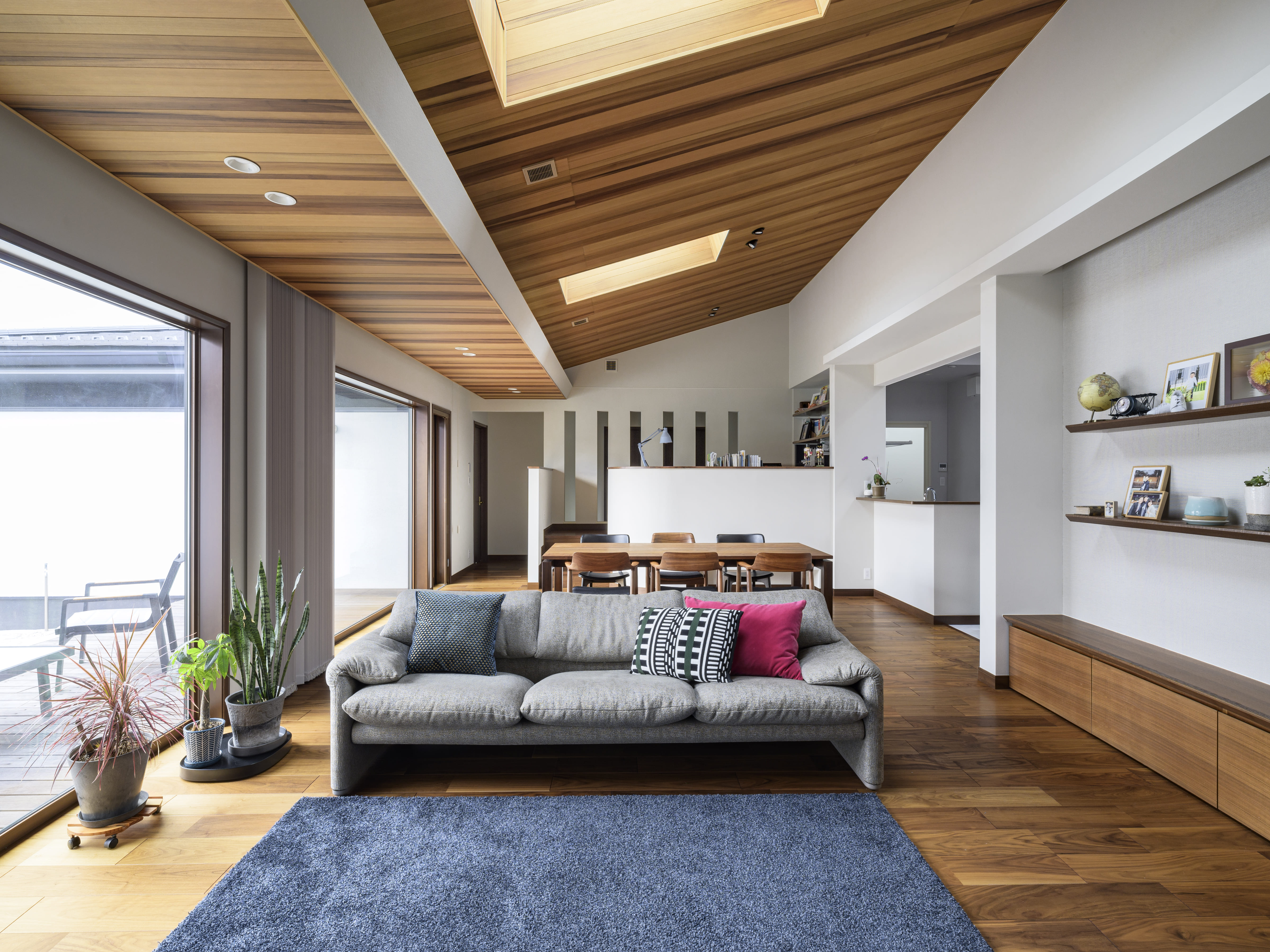 近隣に配慮して前面道路からセットバックすることで建物のインパクトを軽減。塀なども最小限にとどめて、閉鎖的な印象にならないようなデザインに。内観は、リビング、ダイニング、それぞれに天窓もあり、日中は自然光でいっぱいに。