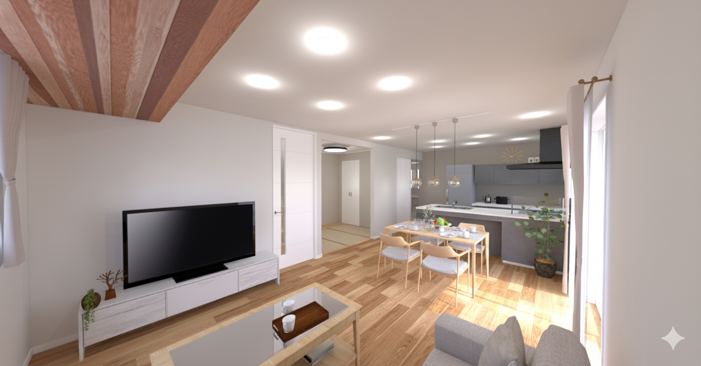 土地約52坪 建物約34坪で3LDK+畳コーナーの間取りをご確認いただけます。