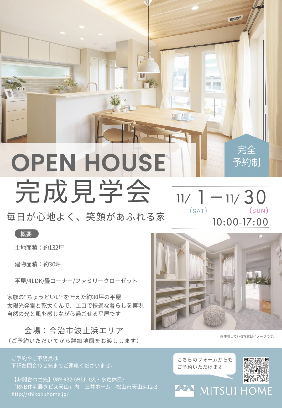 【愛媛エリア】今治市 平屋30坪の完成見学会 開催決定のお知らせ